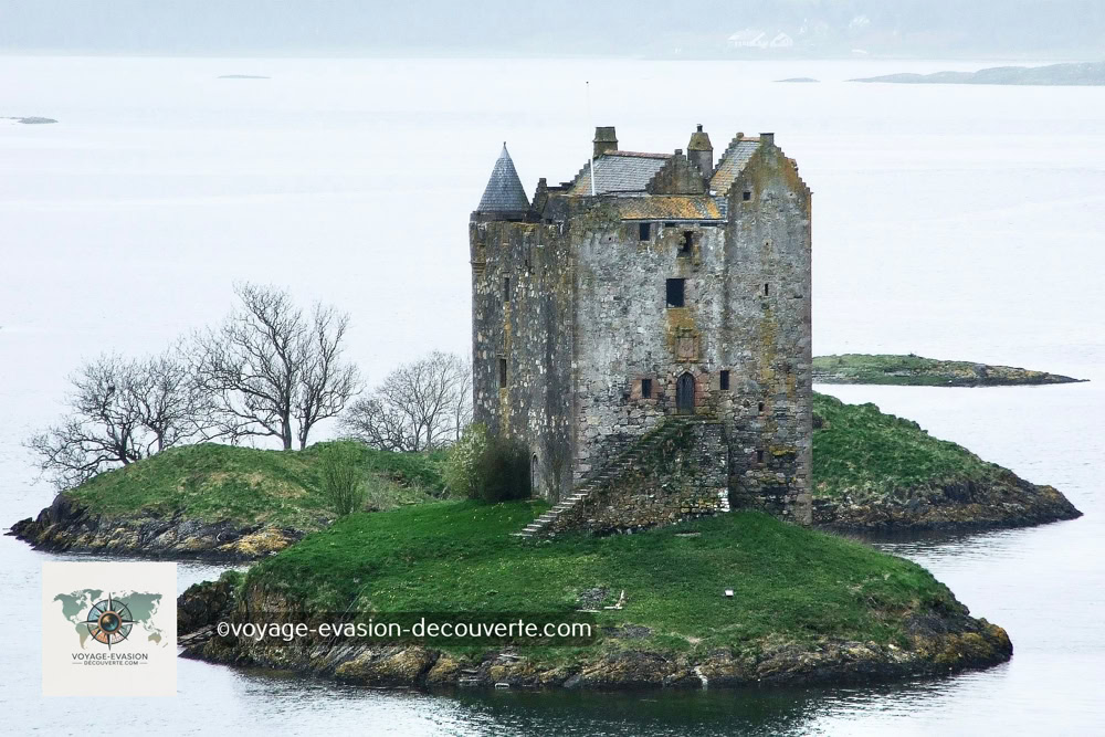 Perché sur un minuscule îlot rocheux au cœur du Loch Laich, un bras du loch Linnhe, le château de Stalker se dresse fièrement face aux montagnes du Morvern et de l’Ardgour.