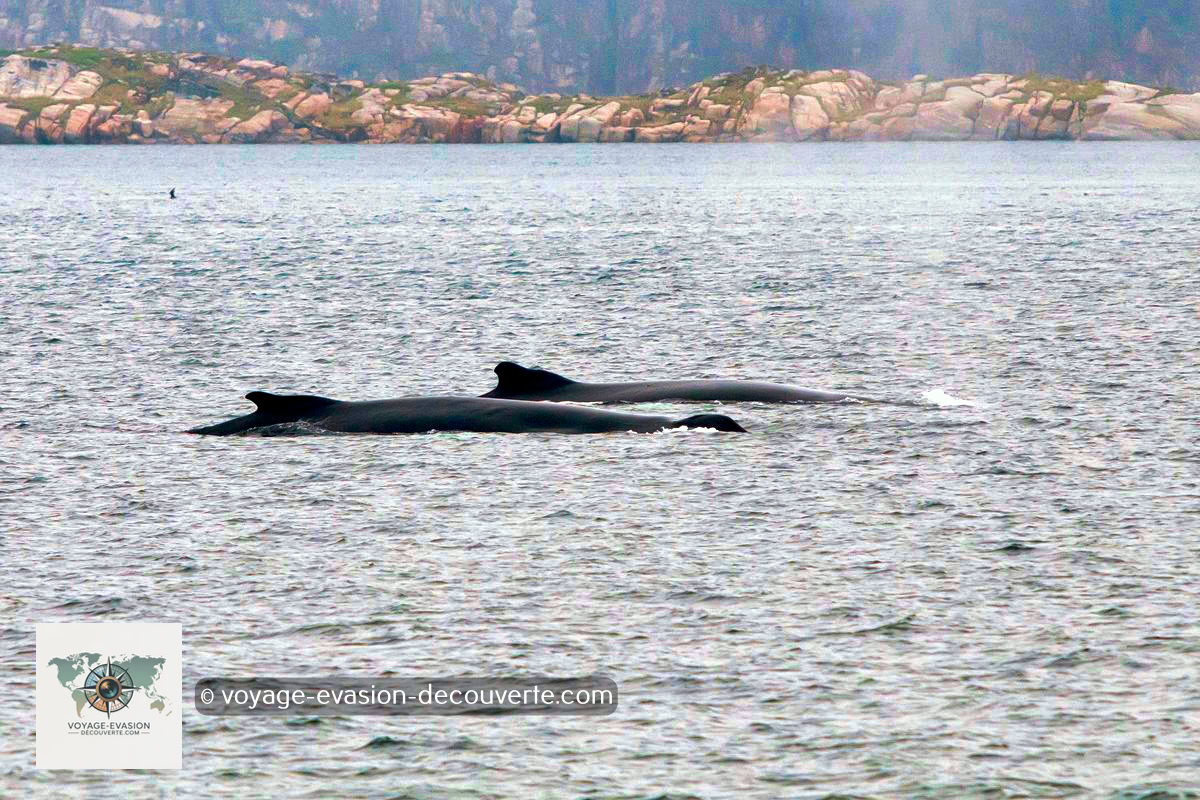 À peine sortis de la baie, deux baleines à bosse sont venues saluer notre départ, leurs silhouettes sombres se découpant sur l’horizon gris.