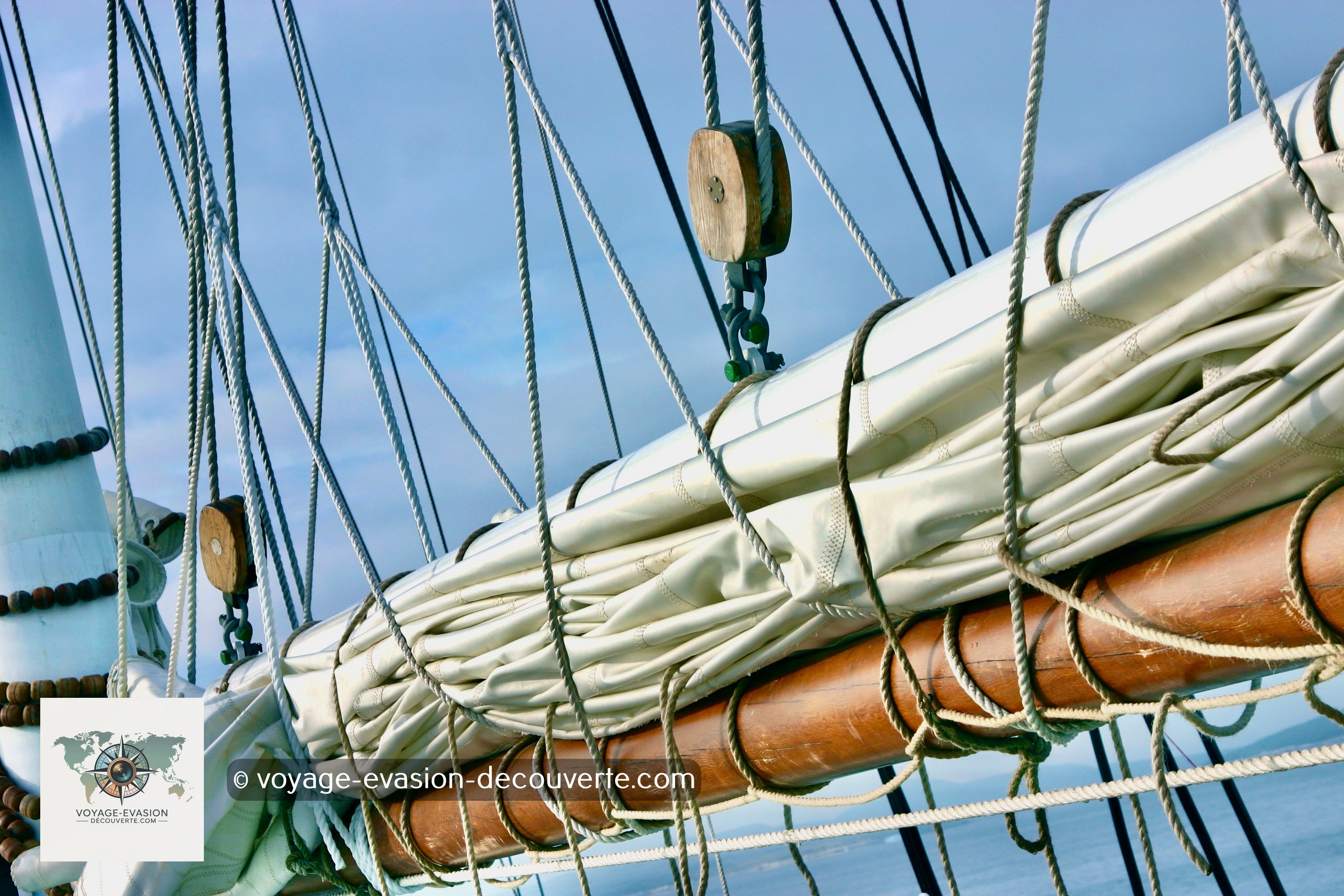 À bord, on retrouve l’atmosphère chaleureuse des grands voiliers d’autrefois, entre le craquement du bois et le sifflement du vent dans les haubans.