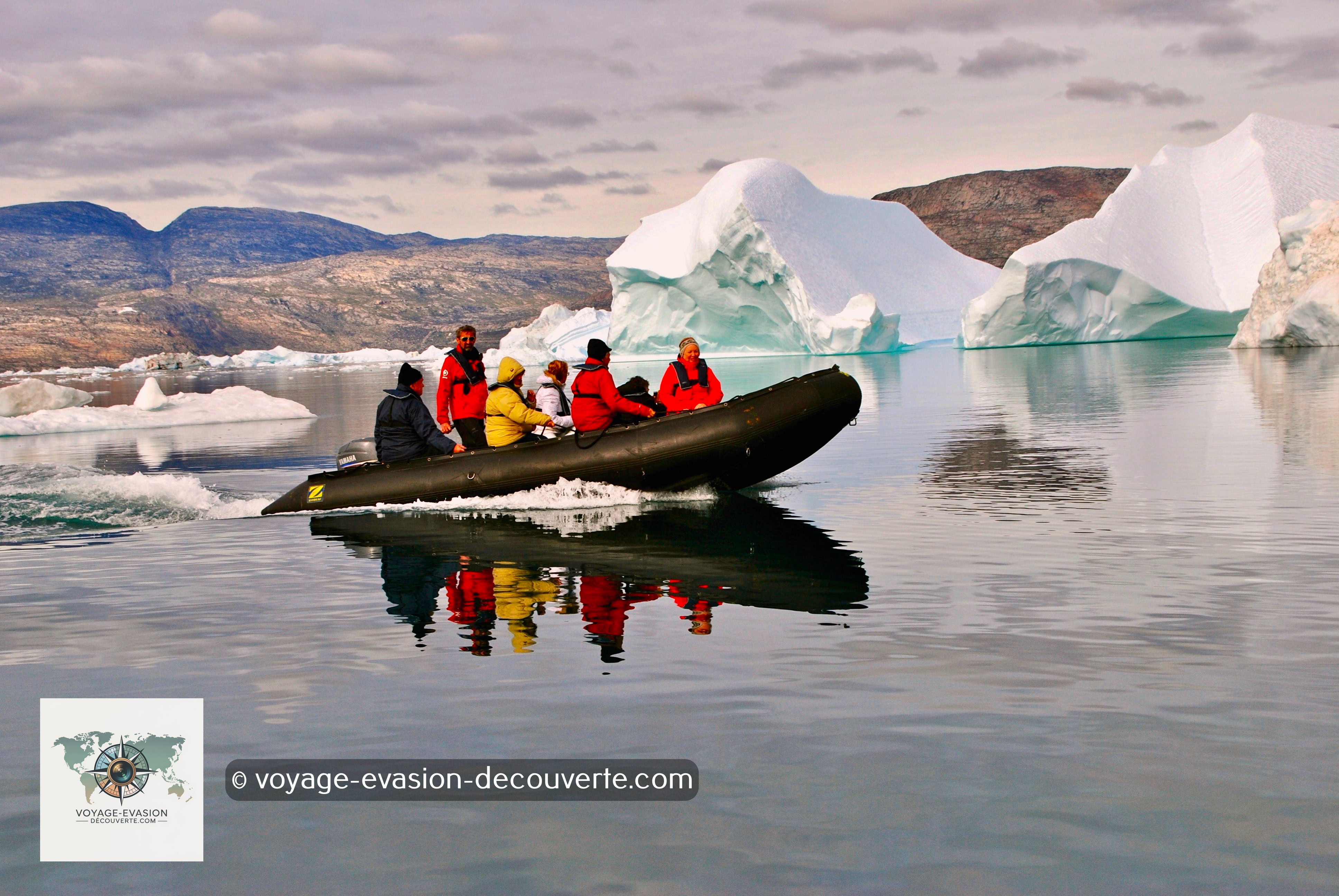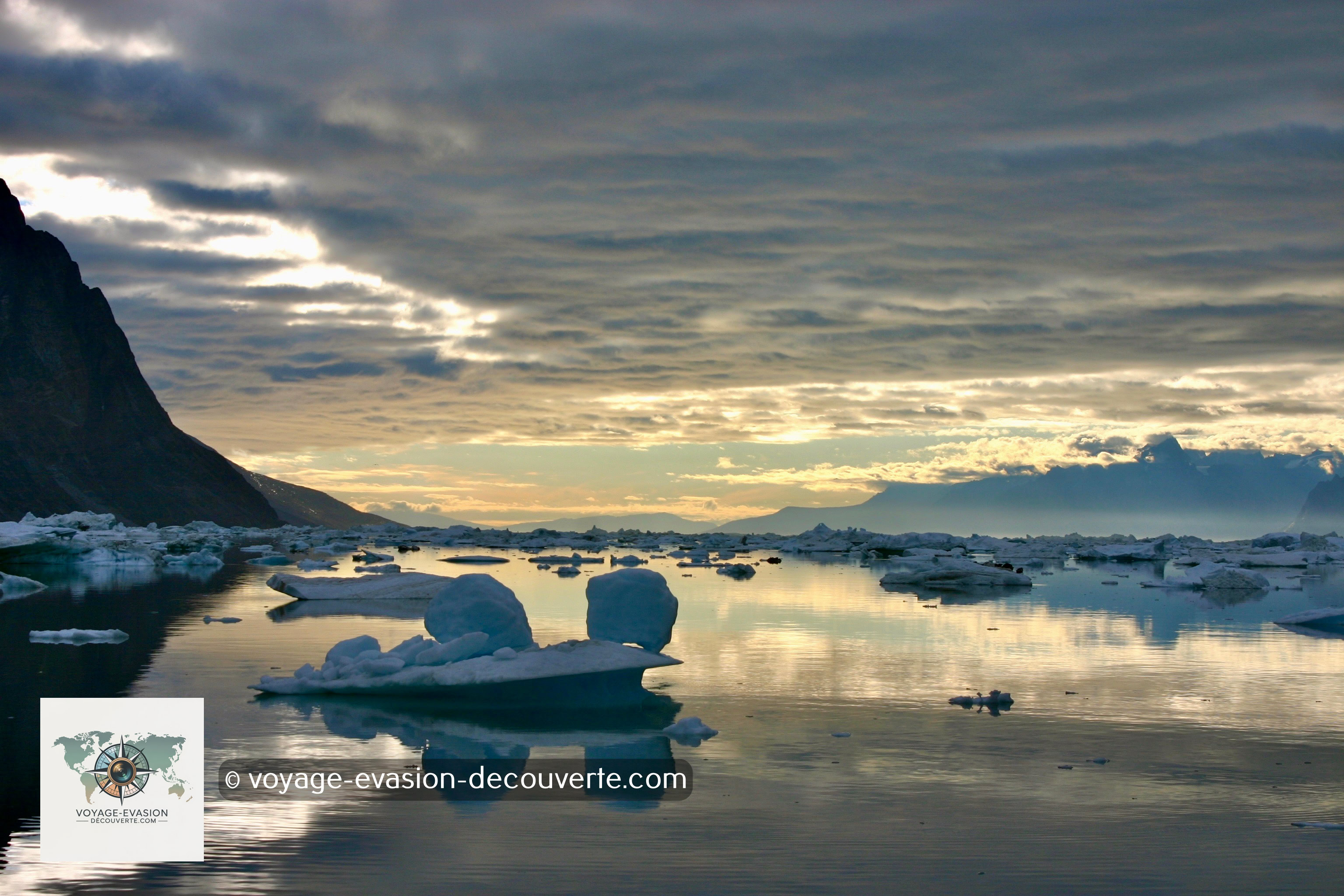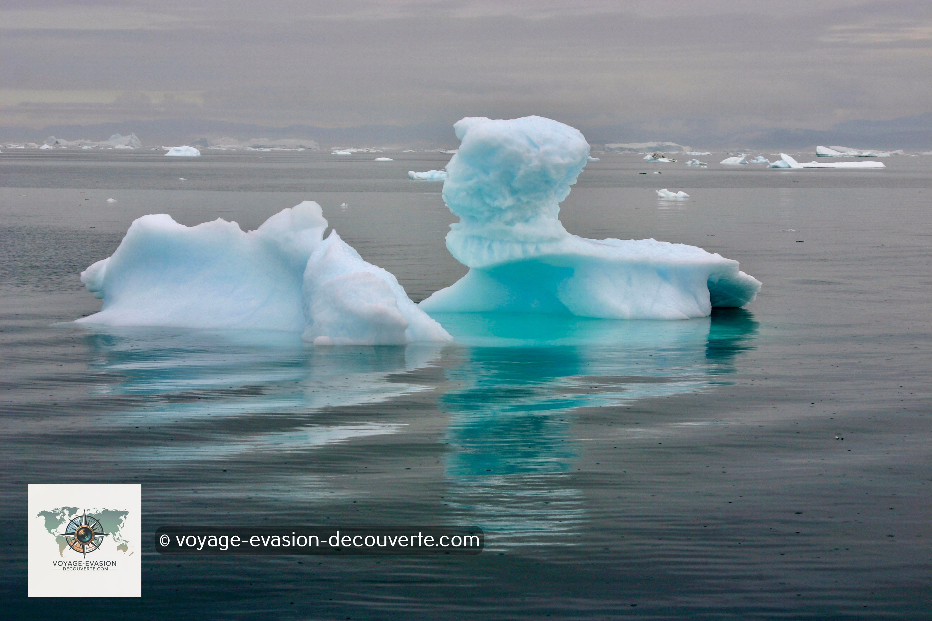De petits gabarits pour le Groenland, mais déjà impressionnants : masses bleutées surgissant d’une mer noire, fantomatiques et majestueuses.