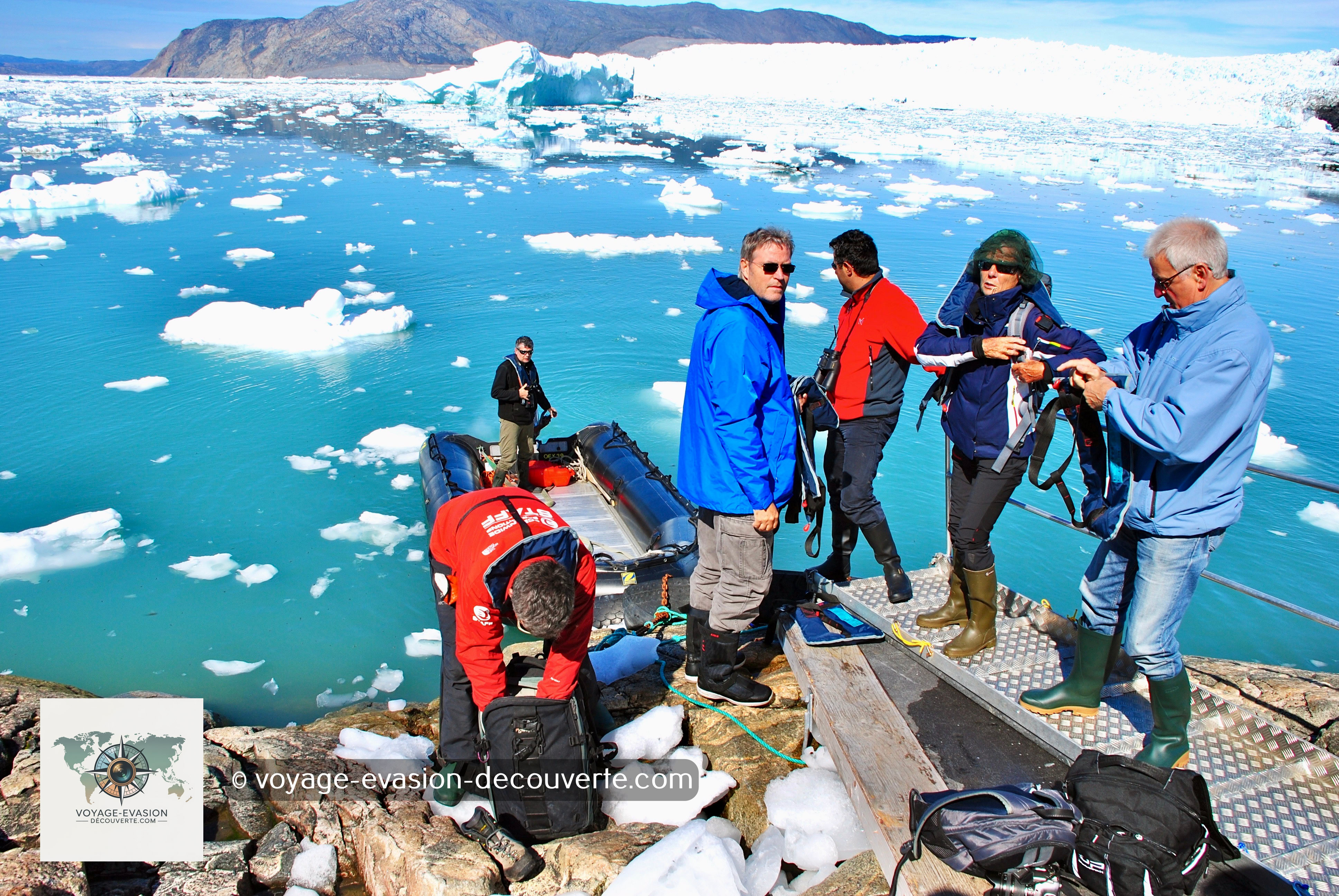 Qu’à cela ne tienne : deux membres de l’équipage embarquent dans un zodiac et partent en quête du trésor glacé, prélevant directement quelques morceaux de banquise flottante.