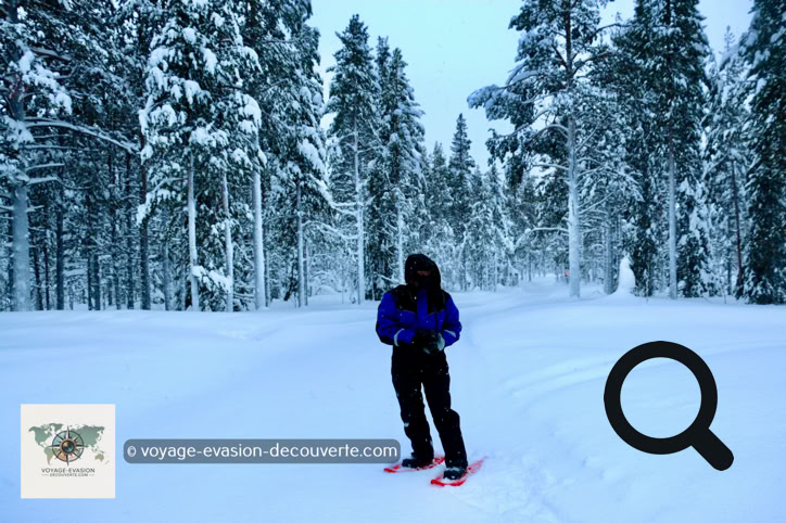 Après un petit déjeuner copieux, nous sommes partis en raquettes explorer la taïga lapone, à la découverte de cette région aussi sauvage que fascinante. L'objectif de cette balade était de suivre les traces laissées par les animaux et les oiseaux, et de comprendre comment la faune et la flore parviennent à survivre à un climat aussi rude.