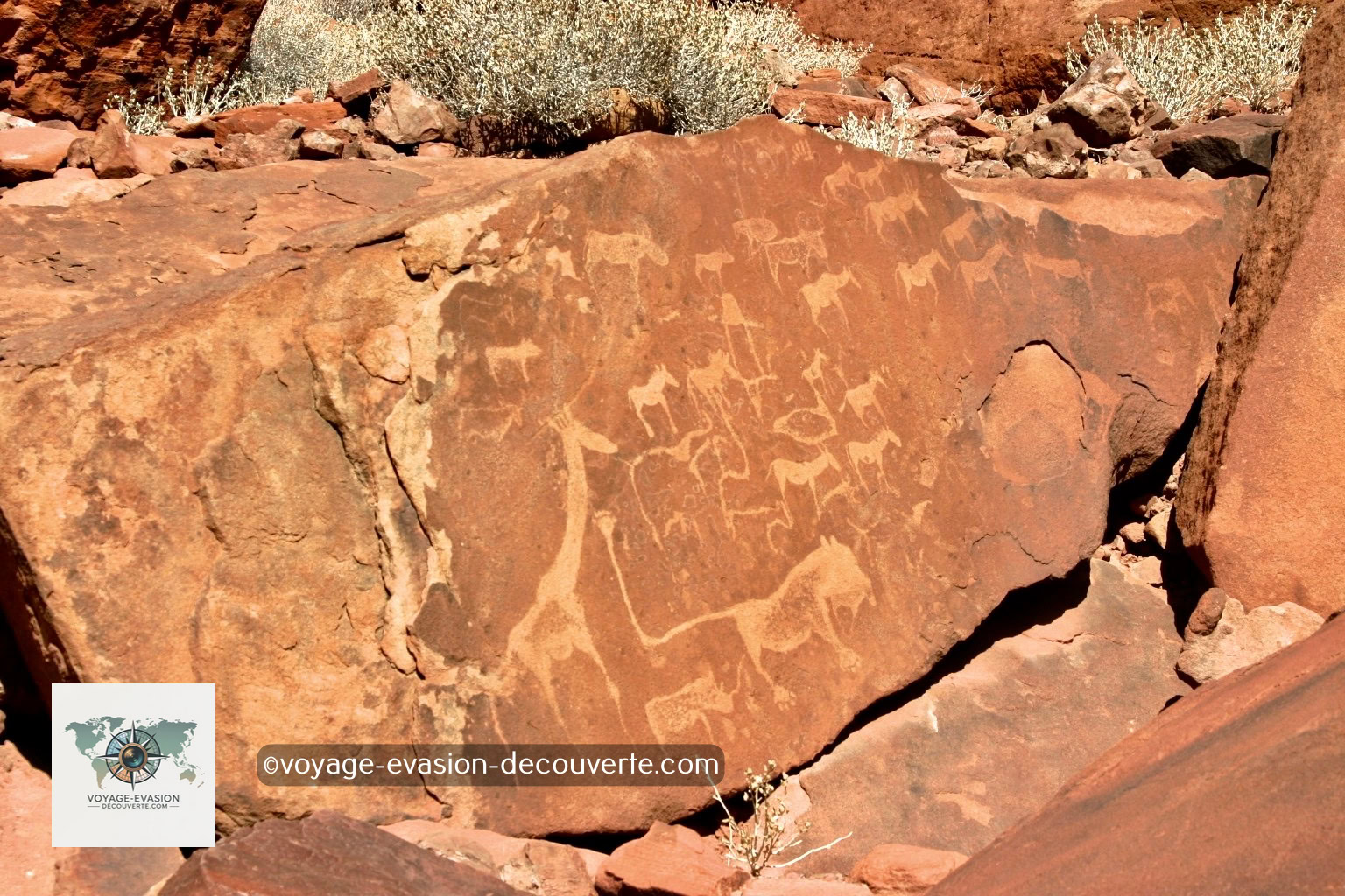 Le site est habité depuis environ 6 000 ans, d’abord par des chasseurs-cueilleurs, puis par des éleveurs, les Khoïkhoïs ou San. Ces peuples ont utilisé cet endroit comme lieu sacré et rituel, créant près de 2 500 gravures rupestres pour accompagner leurs rites chamaniques. Twyfelfontein est aujourd’hui l’une des plus grandes concentrations d’art rupestre d’Afrique, un témoignage exceptionnel de la culture et de la spiritualité des premiers habitants.