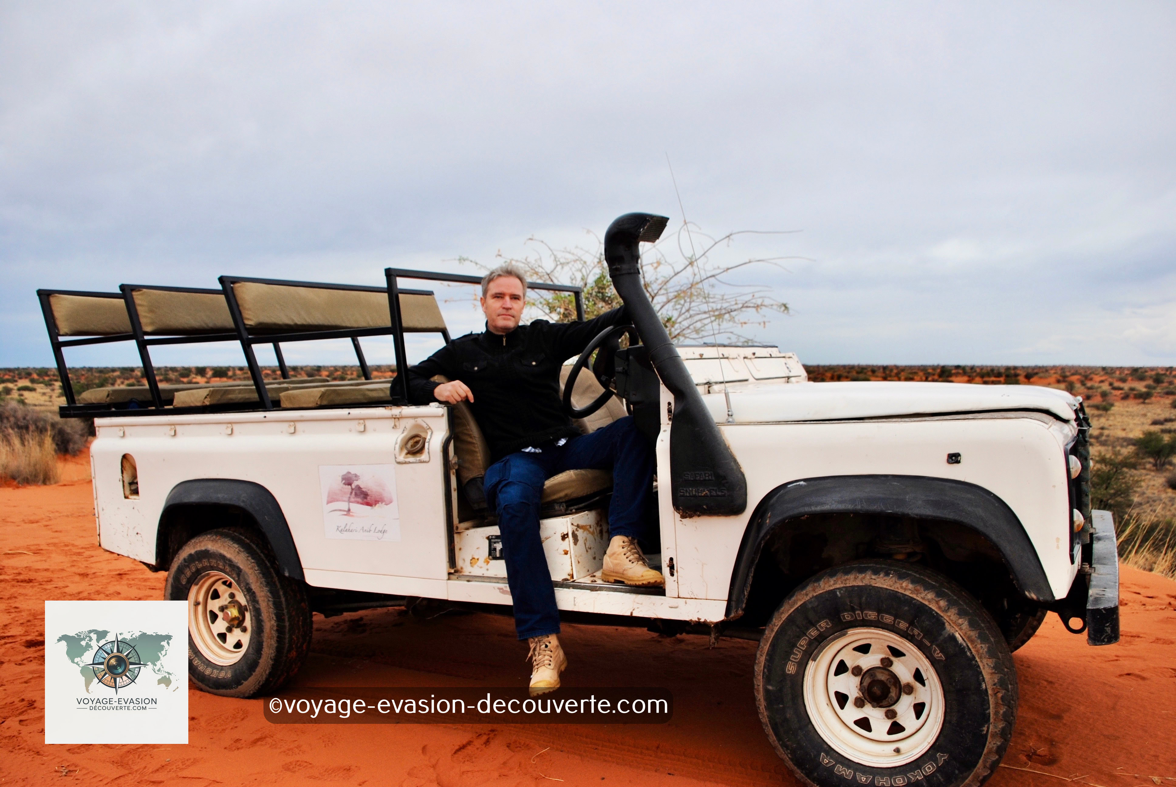 Vers midi, nous arrivons à la Bagatelle Game Reserve, où nous avions réservé une excursion “nature“ à bord d’un véhicule de safari ouvert pour découvrir la région de la ceinture de dunes du Kalahari.