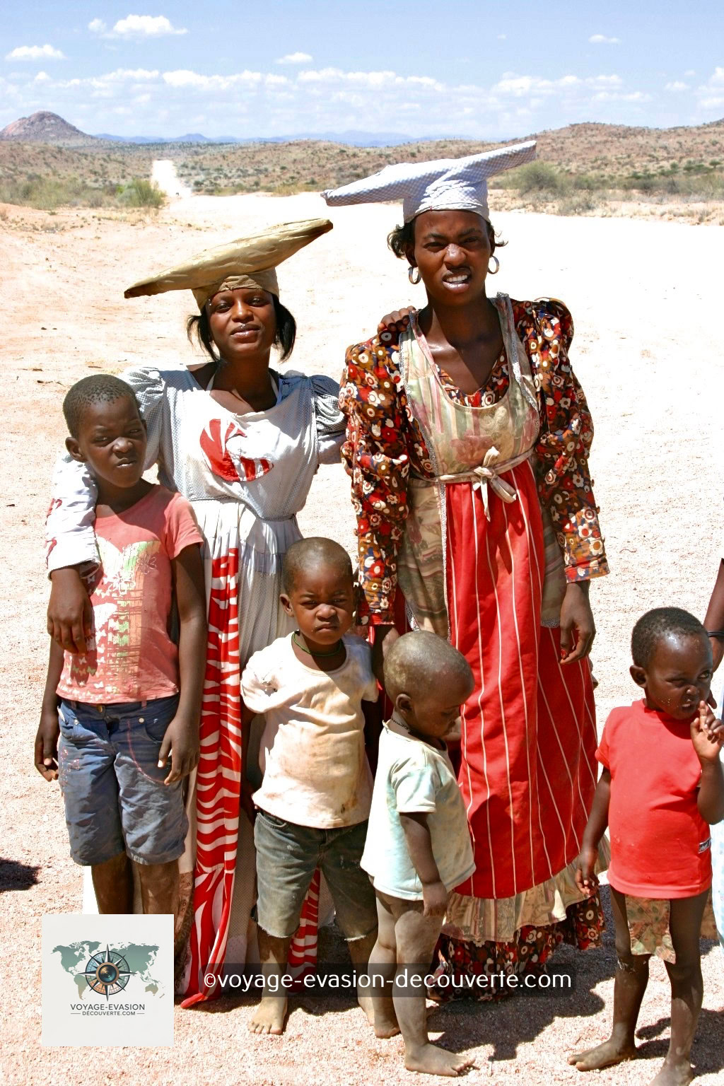 Les Hereros sont également éleveurs, originellement nomades. Les femmes portent de grandes robes superposées inspirées de la mode victorienne et