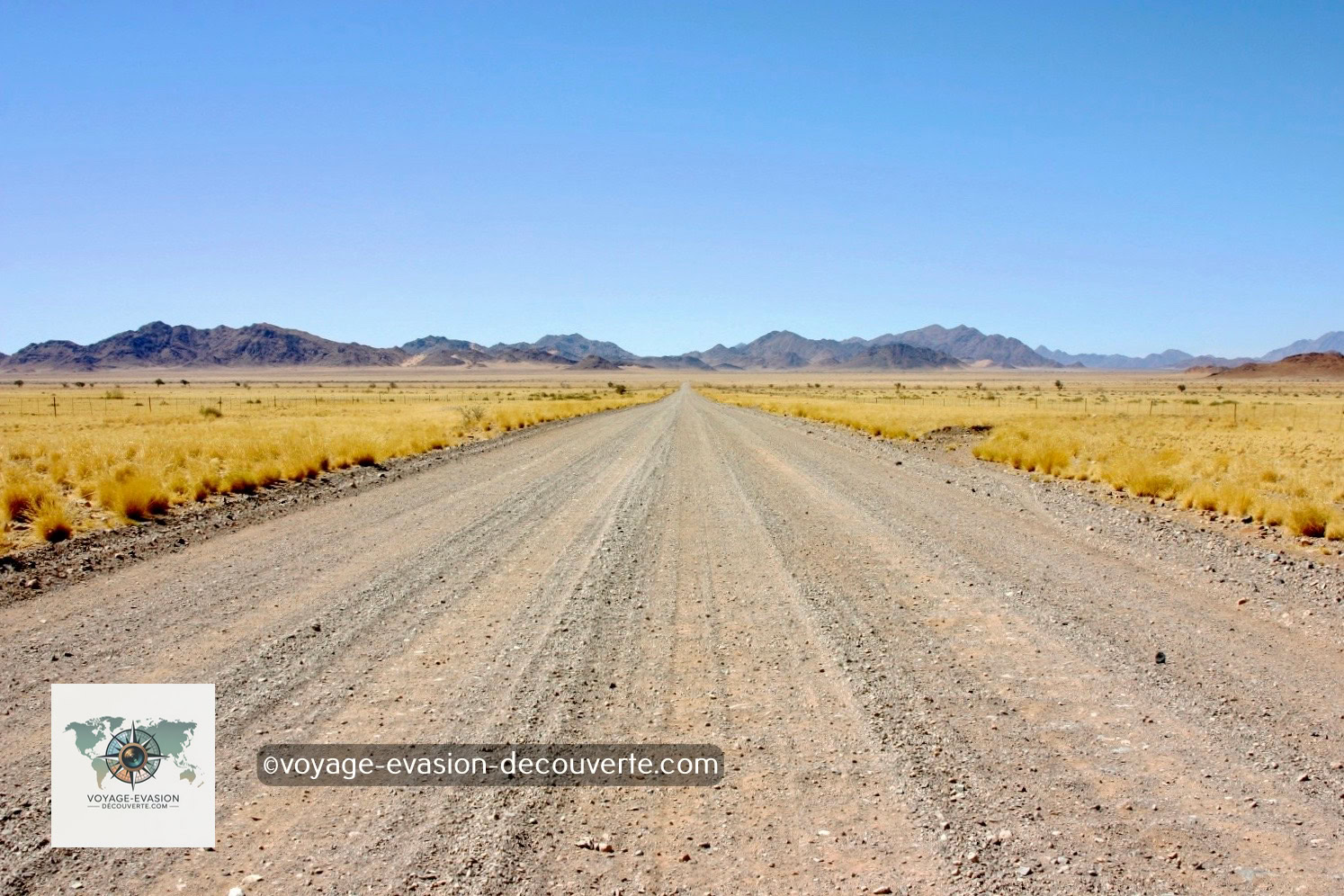 La route bitumée qui relie ces deux villes est un véritable plaisir pour les yeux, traversant des paysages somptueux et changeants : montagnes arides, plaines infinies, et premiers aperçus du désert rouge du Namib.