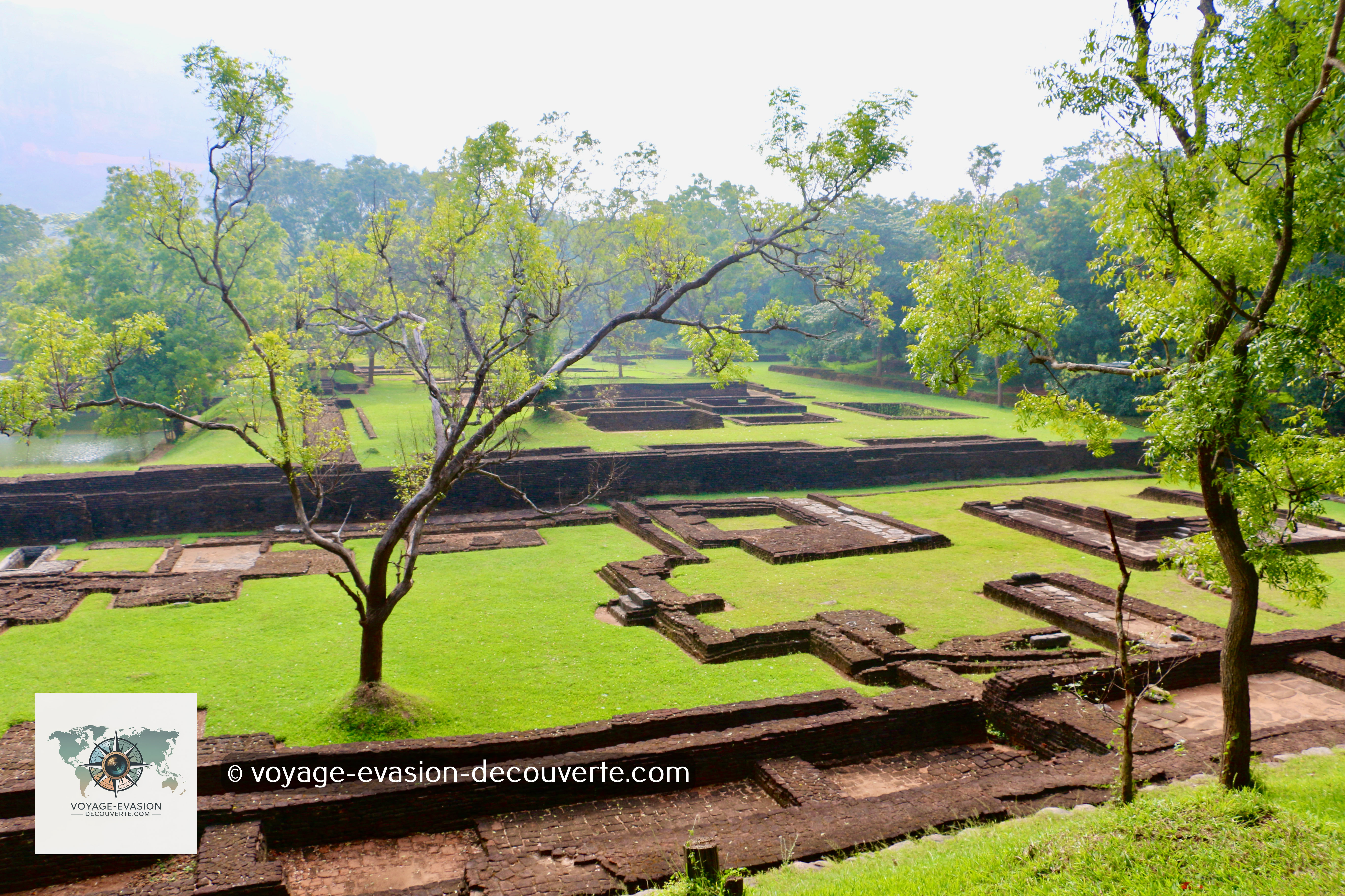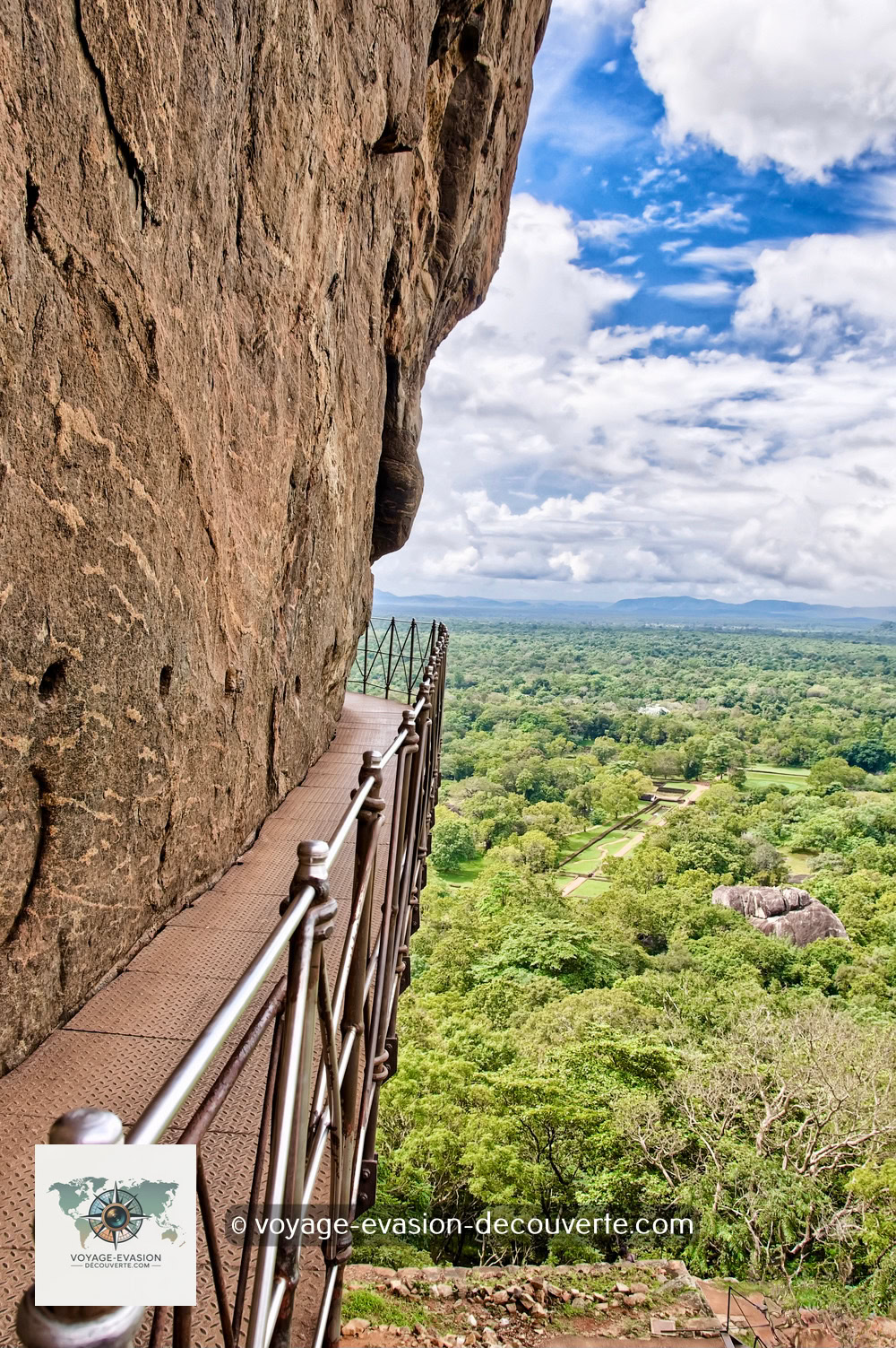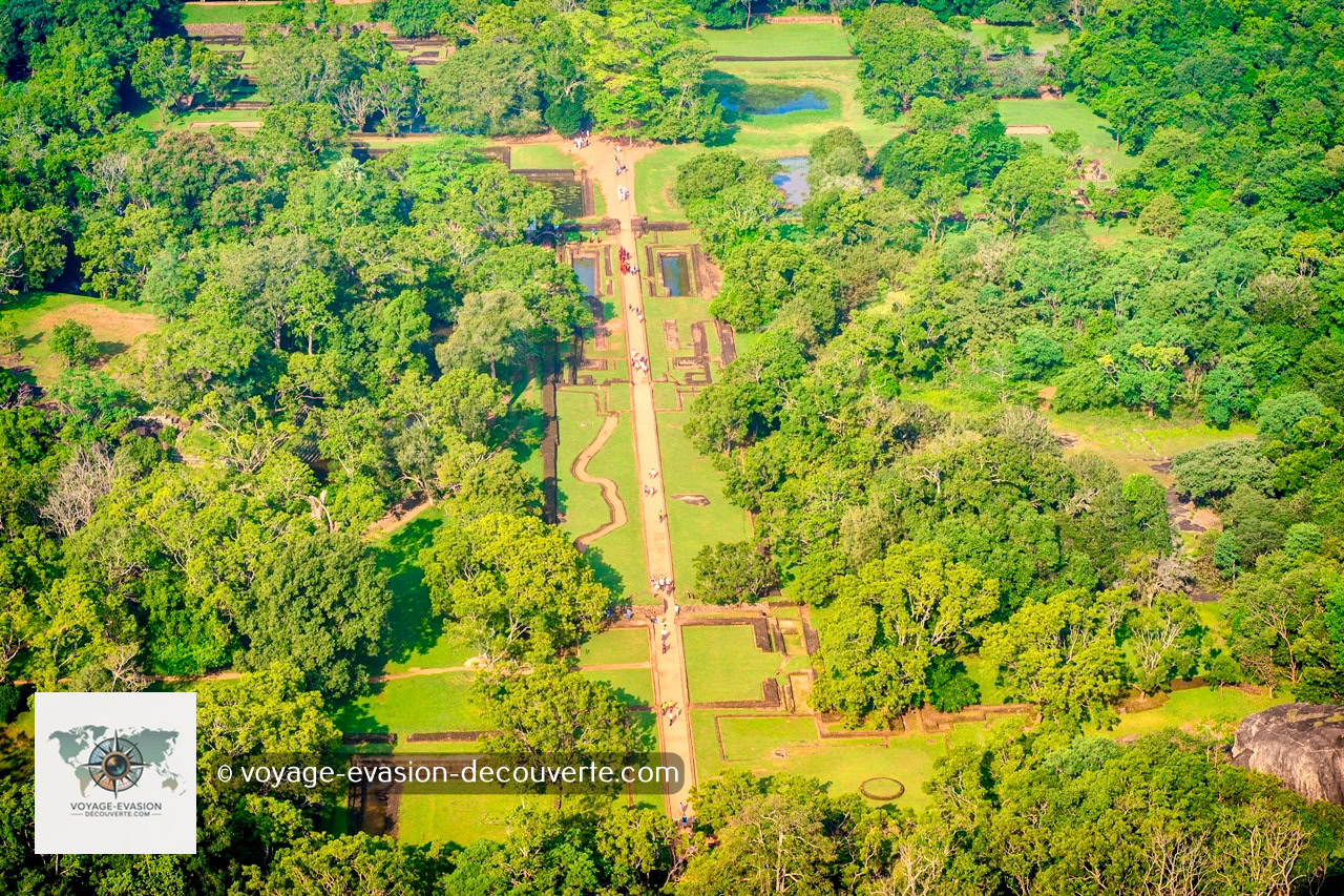 Vous arrivez ensuite aux jardins en terrasse, disposés en gradins, qui mènent directement au rocher de Sigirîya. L'accès se fait par un long passage serpentant vers le nord, le long du mur miroir, jusqu’à la plateforme du Lion.