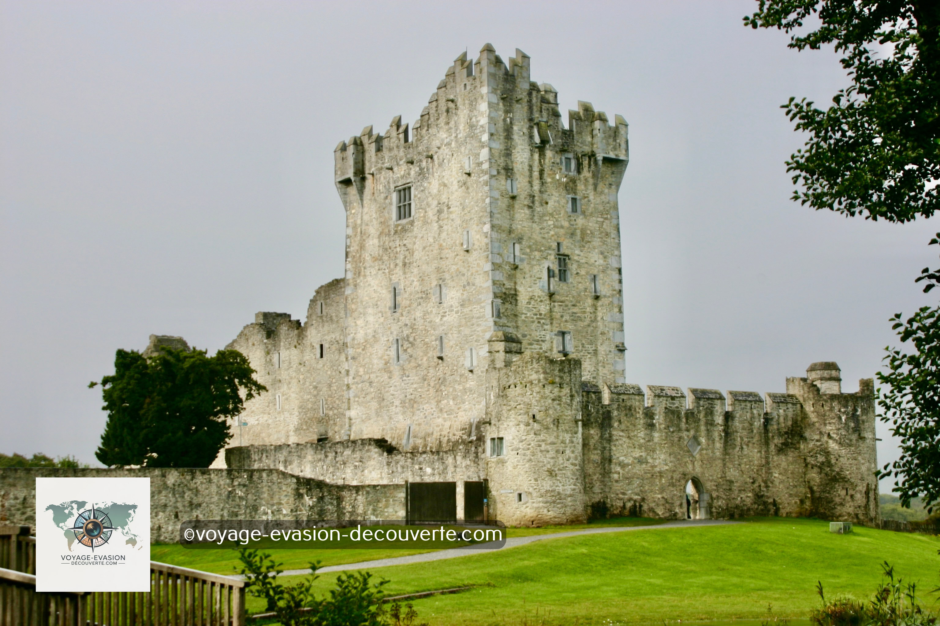 À proximité de la charmante ville de Killarney, nous avons découvert le château de Ross, datant de la fin du XVe siècle. Ce château est un parfait exemple de bastion médiéval irlandais. Son imposant donjon est flanqué d’échauguettes carrées disposées aux angles opposés, tandis que les murs de défense sont renforcés par des tours d’angle rondes, typiques de l’architecture militaire de l’époque. Se promener dans ses cours et le long de ses remparts permet de se plonger dans l’histoire tumultueuse de l’Irlande médiévale.