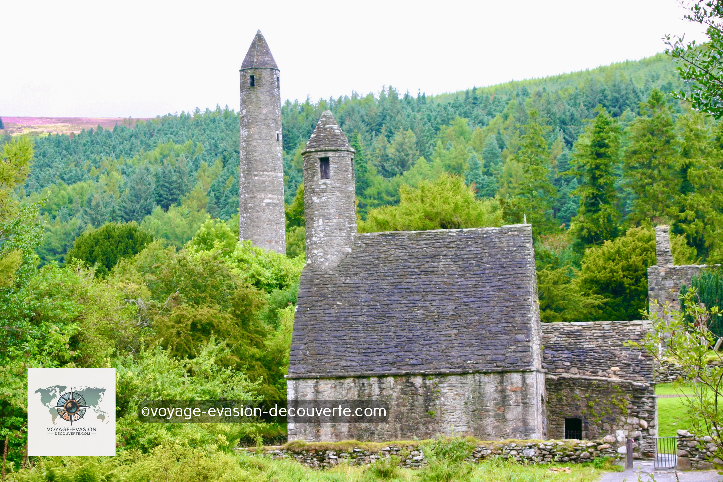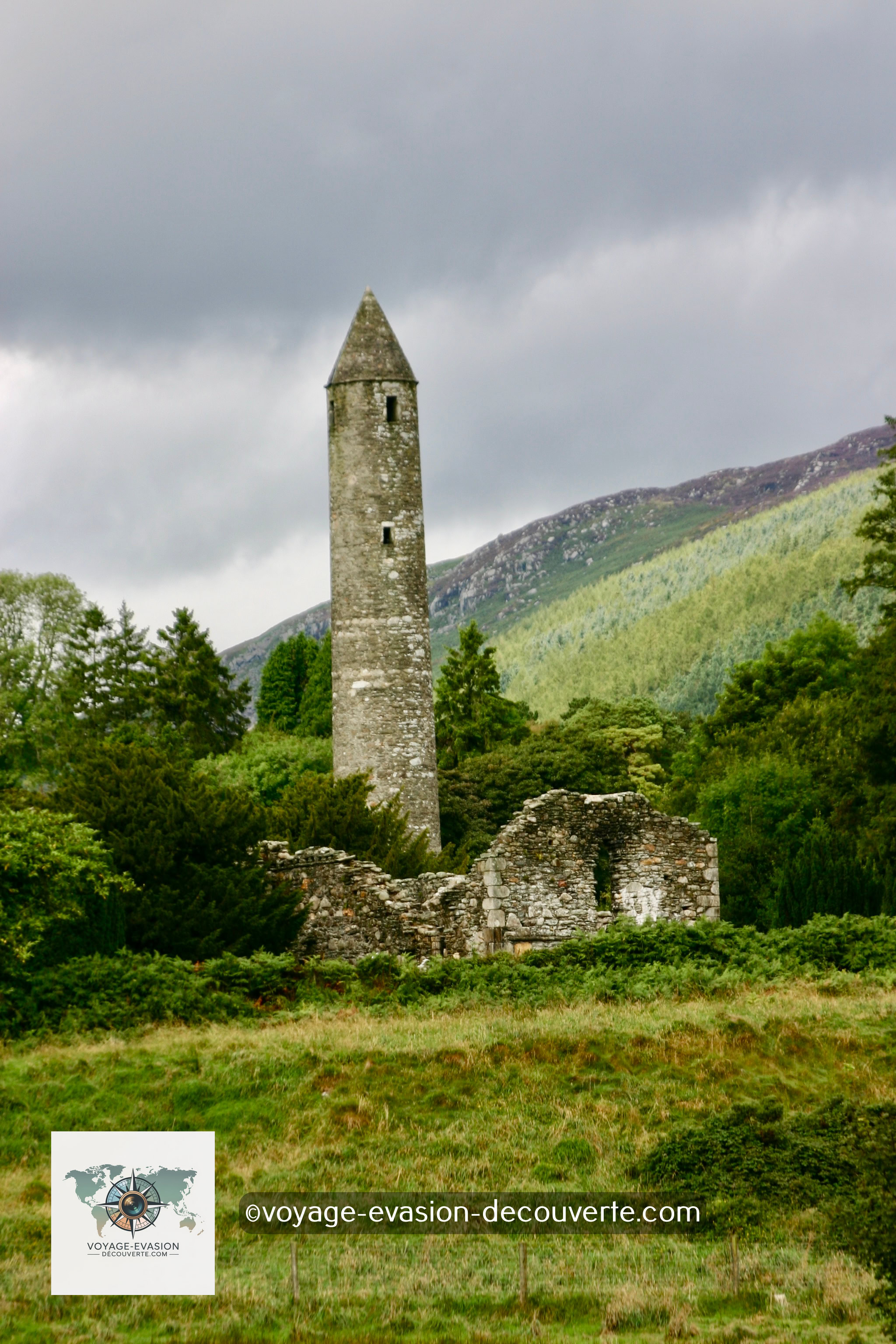 Le site monastique comprend une impressionnante tour ronde de 33 mètres de haut et la célèbre croix de Saint Kevin, une croix celtique majestueuse. La tour, édifiée à l’époque des invasions vikings en Irlande (jusqu’à environ 1066), servait probablement à protéger des reliques, des manuscrits sacrés et des calices précieux.