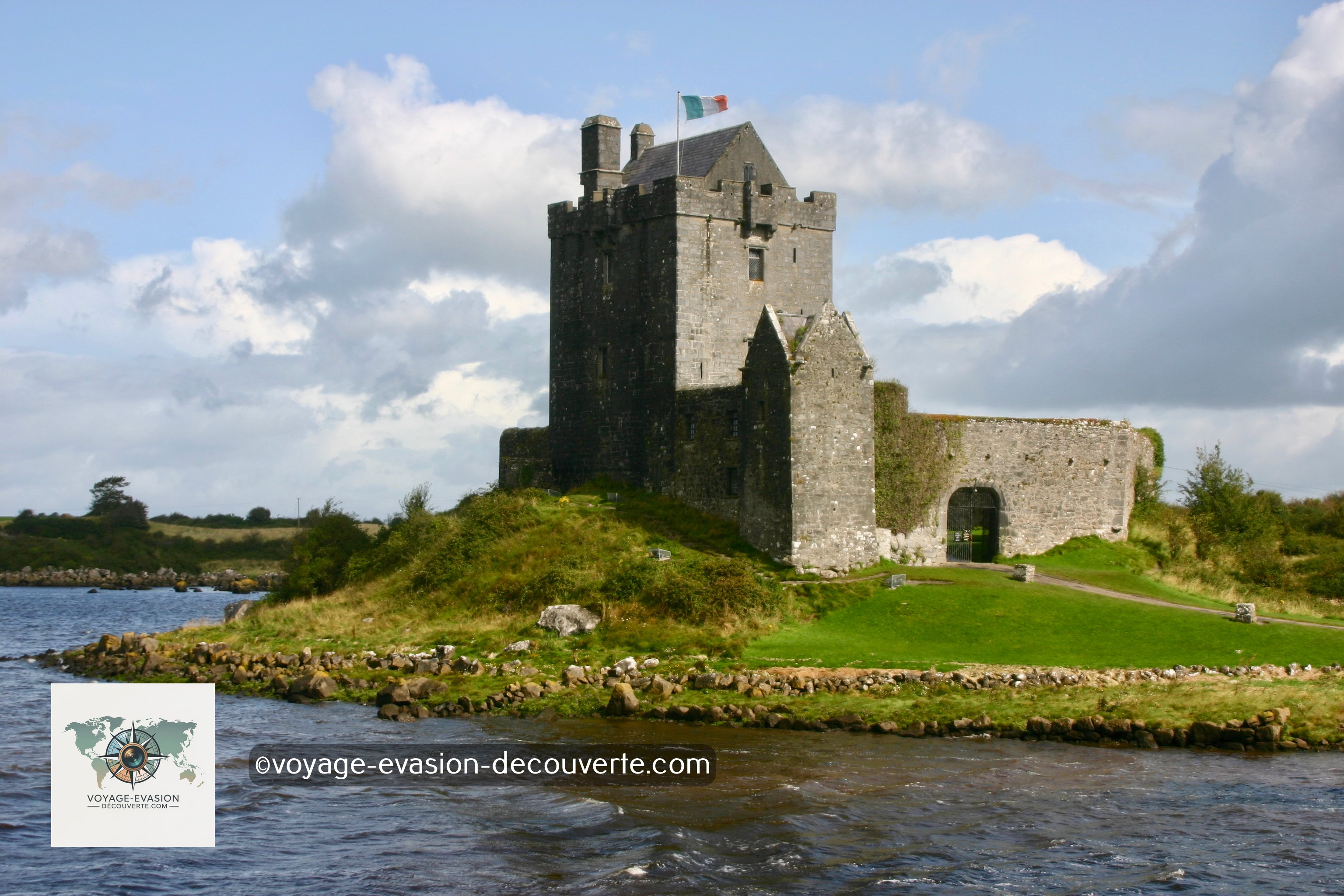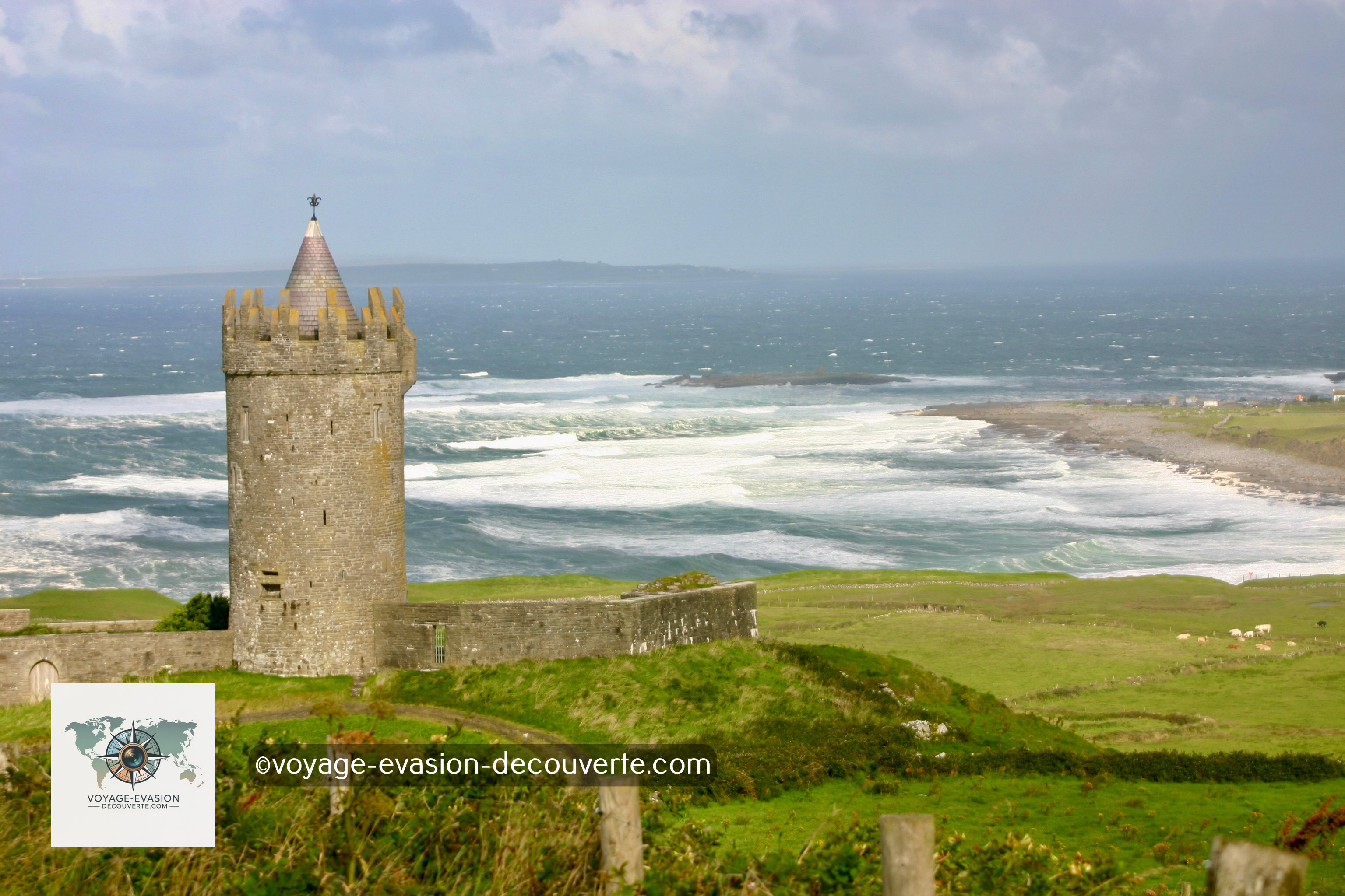 Le château de Dunguaire, construit en 1520 sur les rives de la baie de Galway, est un exemple typique des tours résidentielles du XVIe siècle. Bien qu’on l’appelle château, il ne s’agissait pas d’une forteresse militaire mais plutôt d’une résidence fortifiée pour la noblesse ou les grands fermiers de l’époque. Dans ces contrées, posséder une maison-tour était un symbole de prestige et de pouvoir : elle permettait de surveiller ses terres tout en offrant confort et sécurité. Aujourd’hui, le château est soigneusement restauré et accueille des visiteurs curieux de découvrir l’histoire locale, ainsi que des spectacles médiévaux lors de certaines soirées.