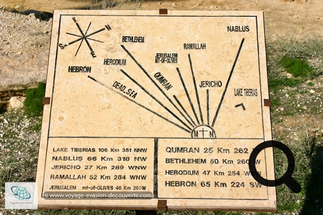 De la terrasse du Mont Nébo, la vue est splendide : on domine toute la vallée du Jourdain, la mer Morte et, par temps clair, on peut même apercevoir les collines de Jéricho.