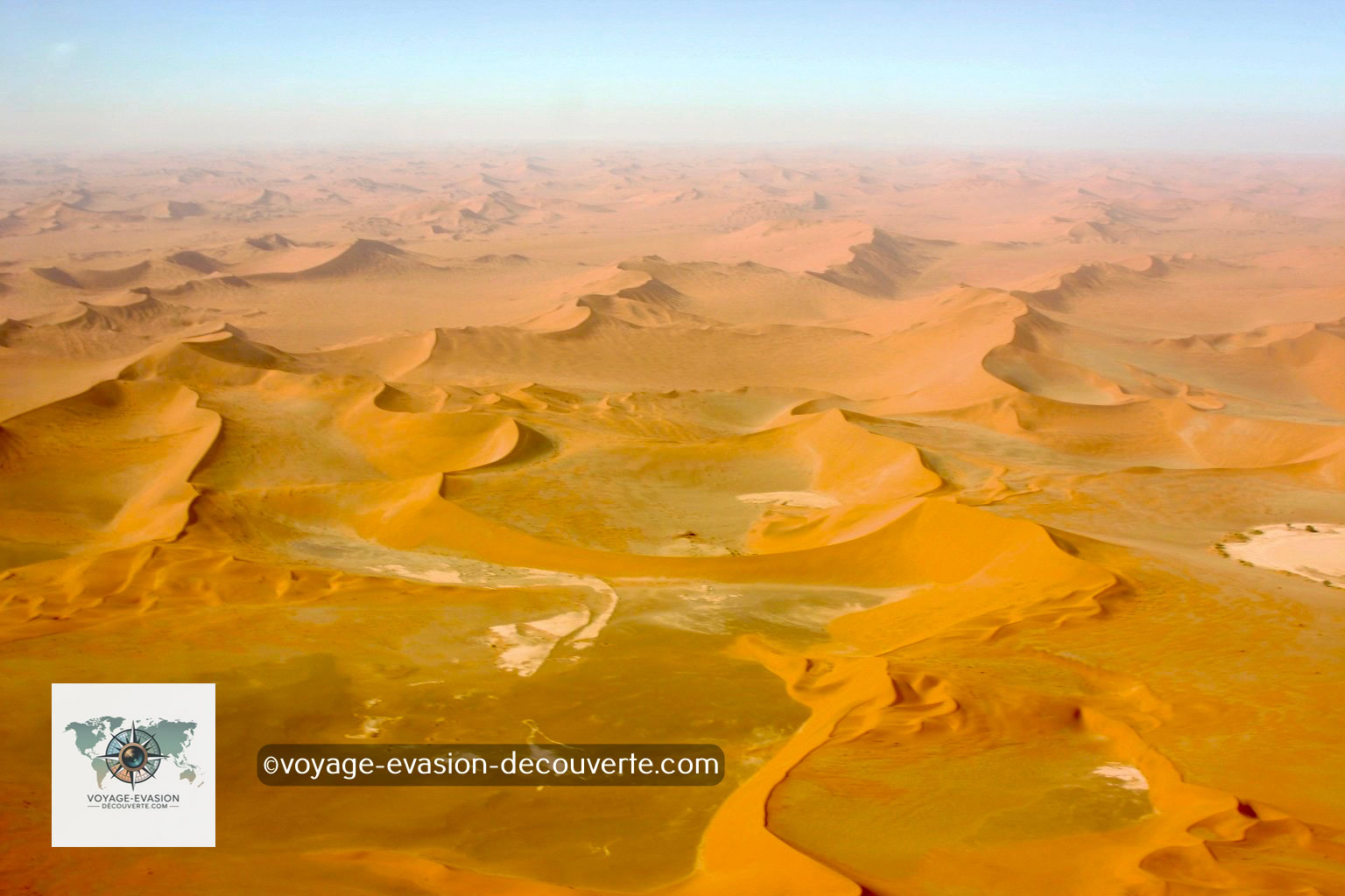 Le lendemain matin, avant de quitter Swakopmund, nous avons loué un petit avion pour survoler le salar de Sossusvlei et le désert du Namib. C’était un spectacle grandiose et inoubliable : les paysages défilaient sous nos yeux, changeant constamment de couleurs et de textures, passant du blanc éclatant des salars à l’orange flamboyant des dunes, parsemés d’ombre et de lumière. Le vol a duré 2h15, et je recommande vivement de réserver la veille, car la demande est forte et le ciel se prête souvent à ce voyage féérique.