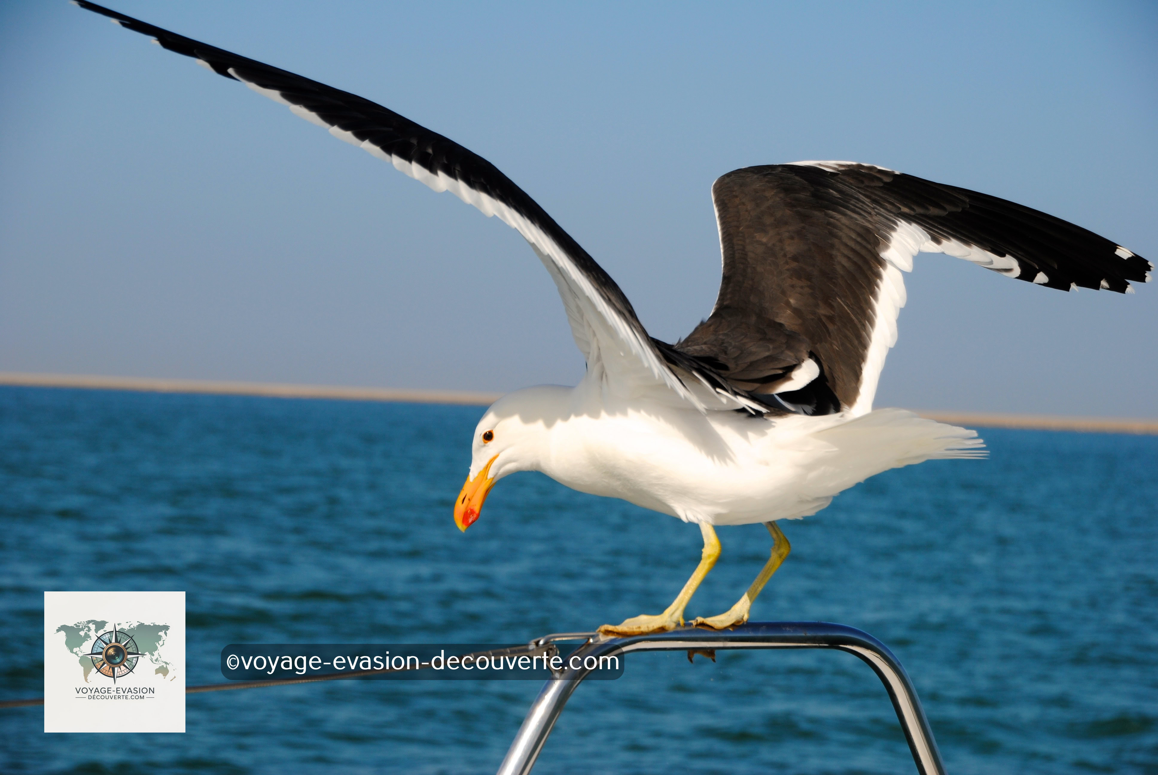 Les eaux froides de l’Atlantique Sud abritent également des otaries à fourrure d’Afrique du Sud, qui se prélassent au soleil et nagent avec aisance dans la lagune. Nous avons loué un catamaran pour observer la faune locale de plus près. Au cours de notre balade, nous avons même eu un passager clandestin : une jolie otarie qui, très curieuse, s’est approchée de notre embarcation, nous offrant un moment tendre et amusant avant de repartir dans l’océan.