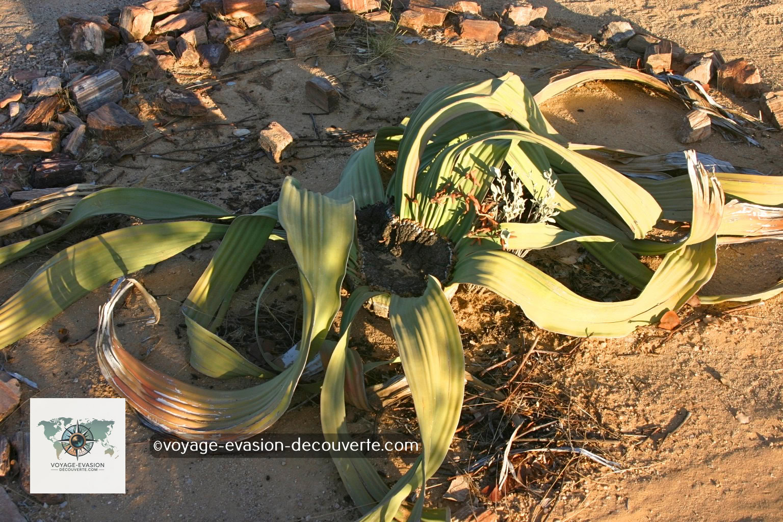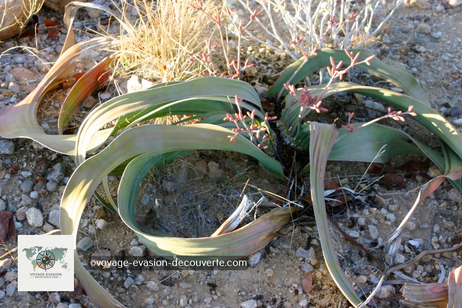 La Welwitschia est constituée de deux grandes feuilles linéaires qui poussent de manière continue dans des directions opposées, dont les extrémités se déchirent et se fragmentent avec le temps. Ce qui frappe le plus, c’est sa longévité incroyable : certains spécimens observés ont entre 1 000 et