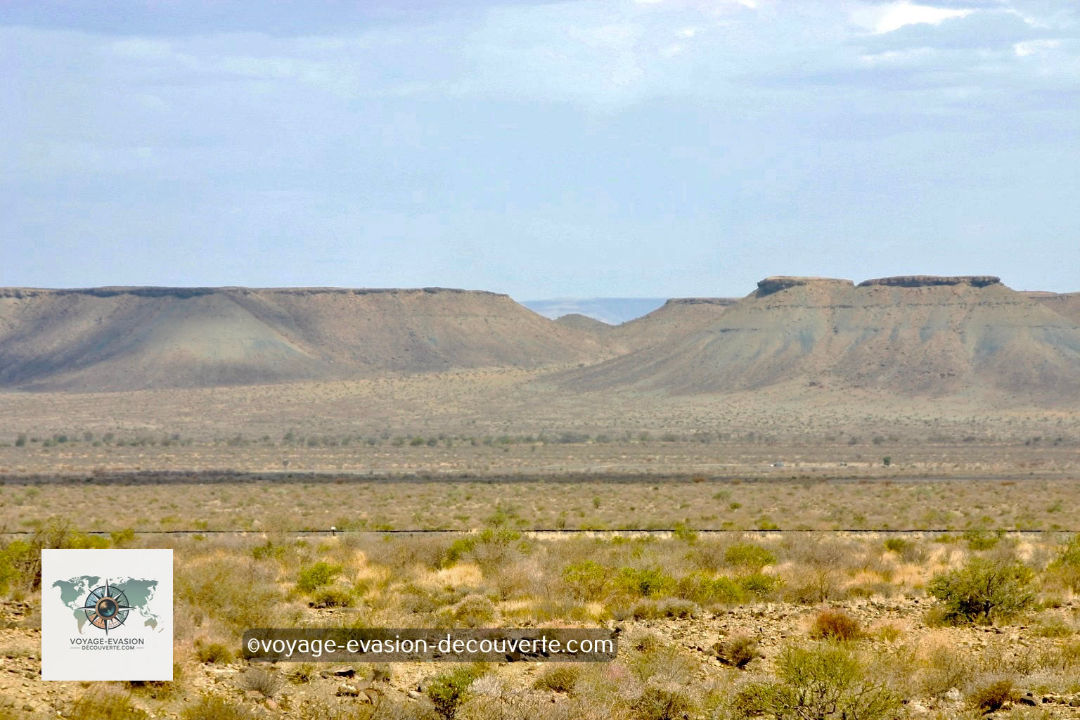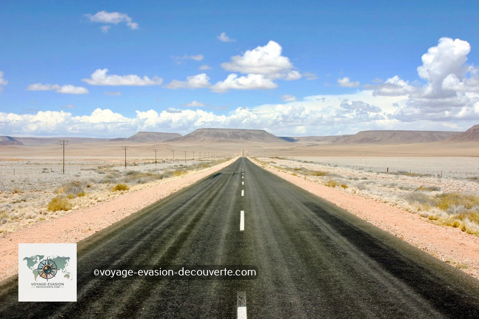 La route bitumée qui relie ces deux villes est un véritable plaisir pour les yeux, traversant des paysages somptueux et changeants : montagnes arides, plaines infinies, et premiers aperçus du désert rouge du Namib.
