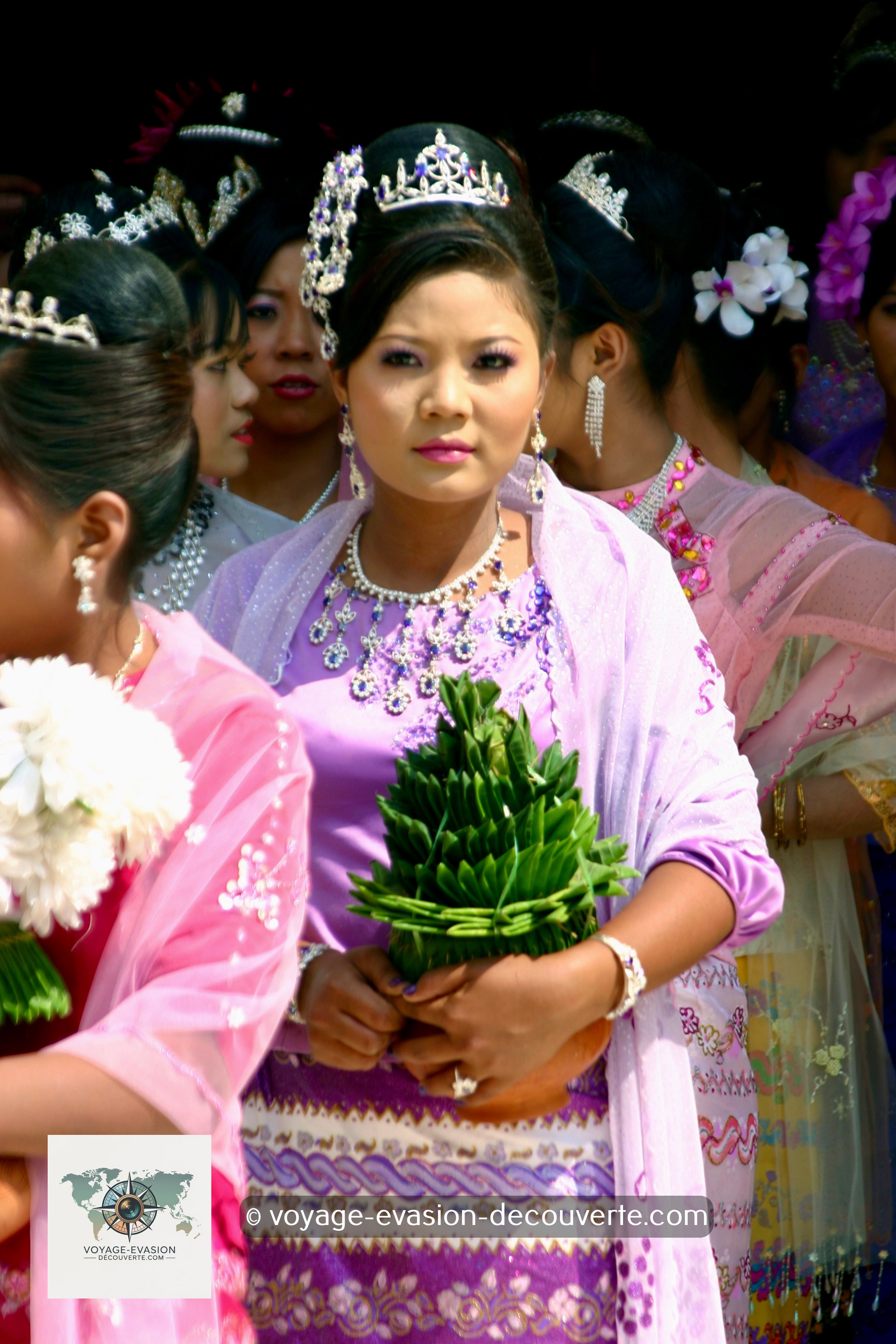 Les femmes, drapées dans leurs longyis colorés, portent sur la tête les coiffes rouges ou orange typiques de l’ethnie Shan.