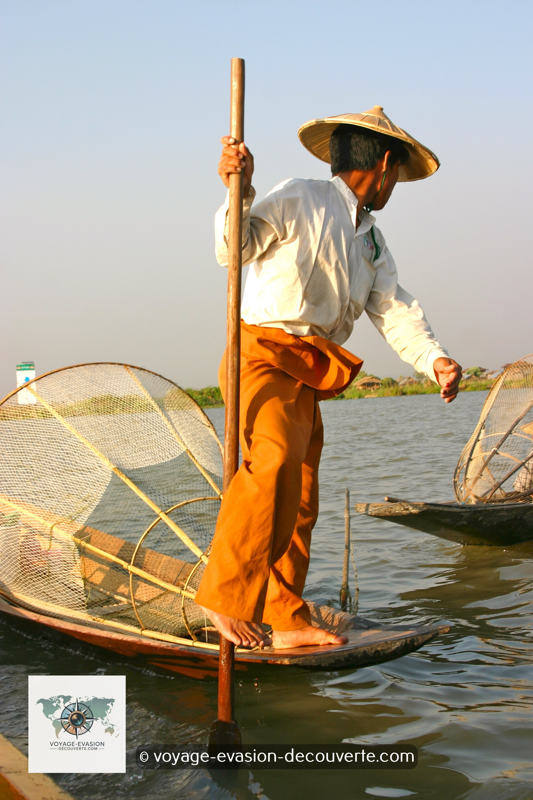 Les pêcheurs Intha sont célèbres pour leur technique unique de rame : debout à la poupe, ils rament d’une jambe, l’autre enroulée autour de la godille, pour garder les mains libres et observer au-dessus des herbes flottantes.