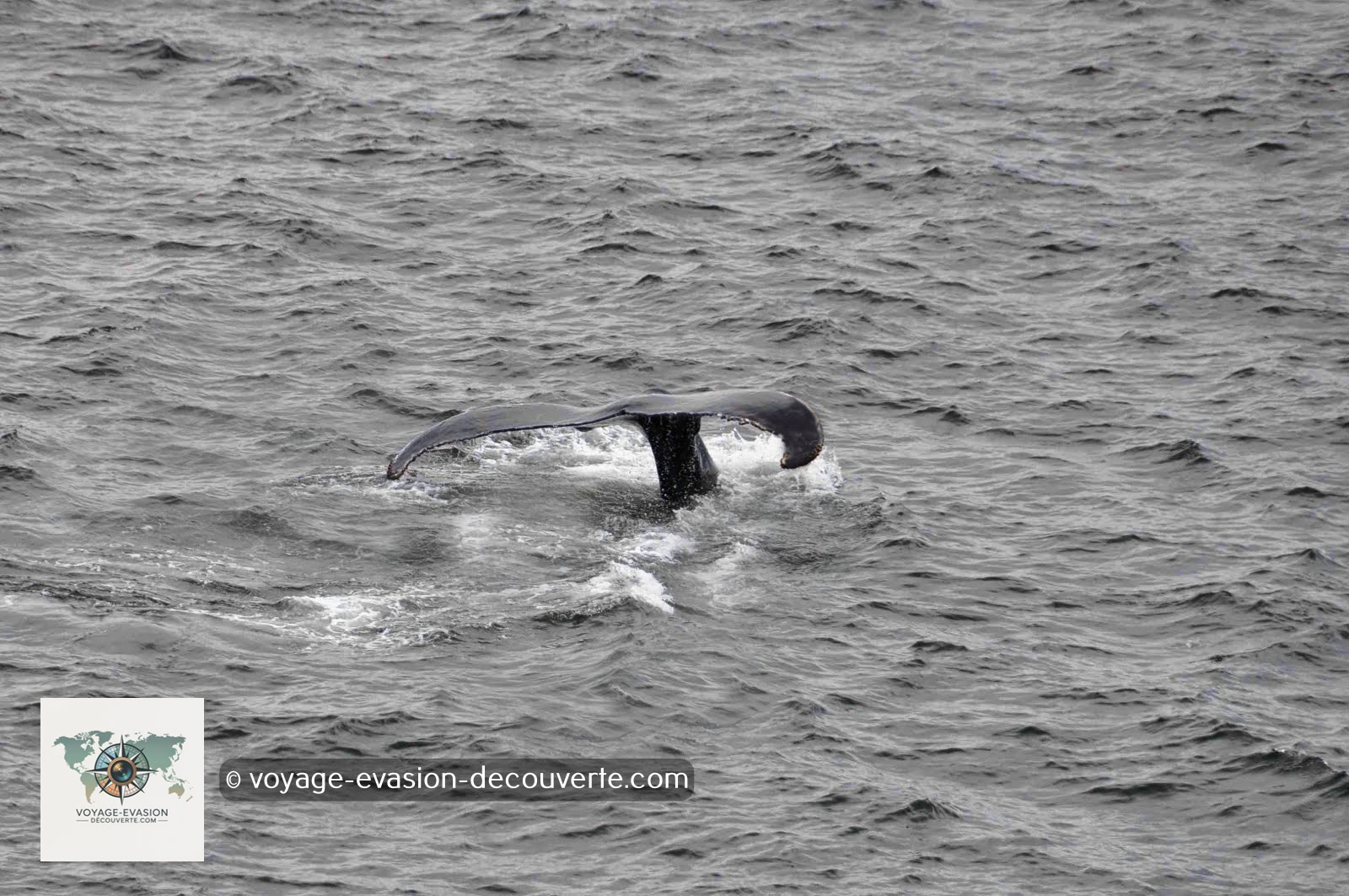 À peine sortis de la baie, deux baleines à bosse sont venues saluer notre départ, leurs silhouettes sombres se découpant sur l’horizon gris.