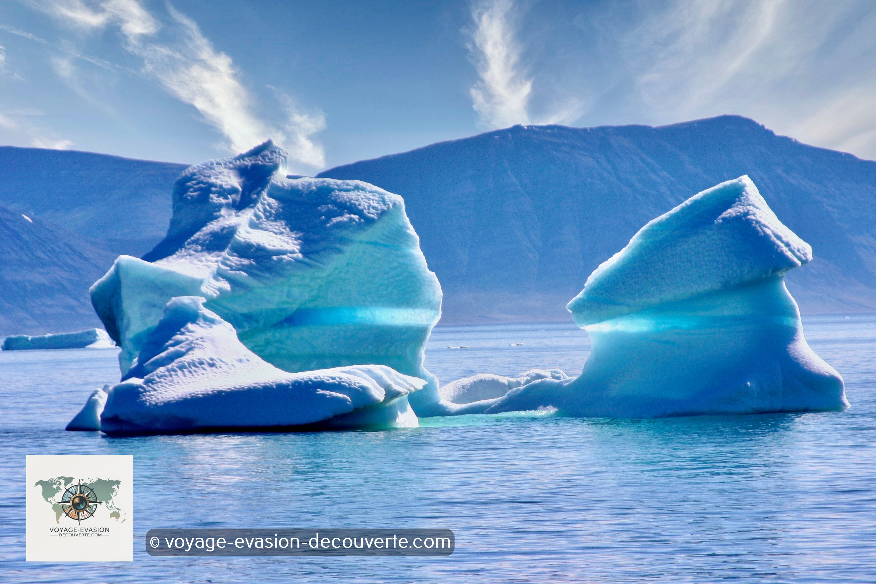 De petits gabarits pour le Groenland, mais déjà impressionnants : masses bleutées surgissant d’une mer noire, fantomatiques et majestueuses.
