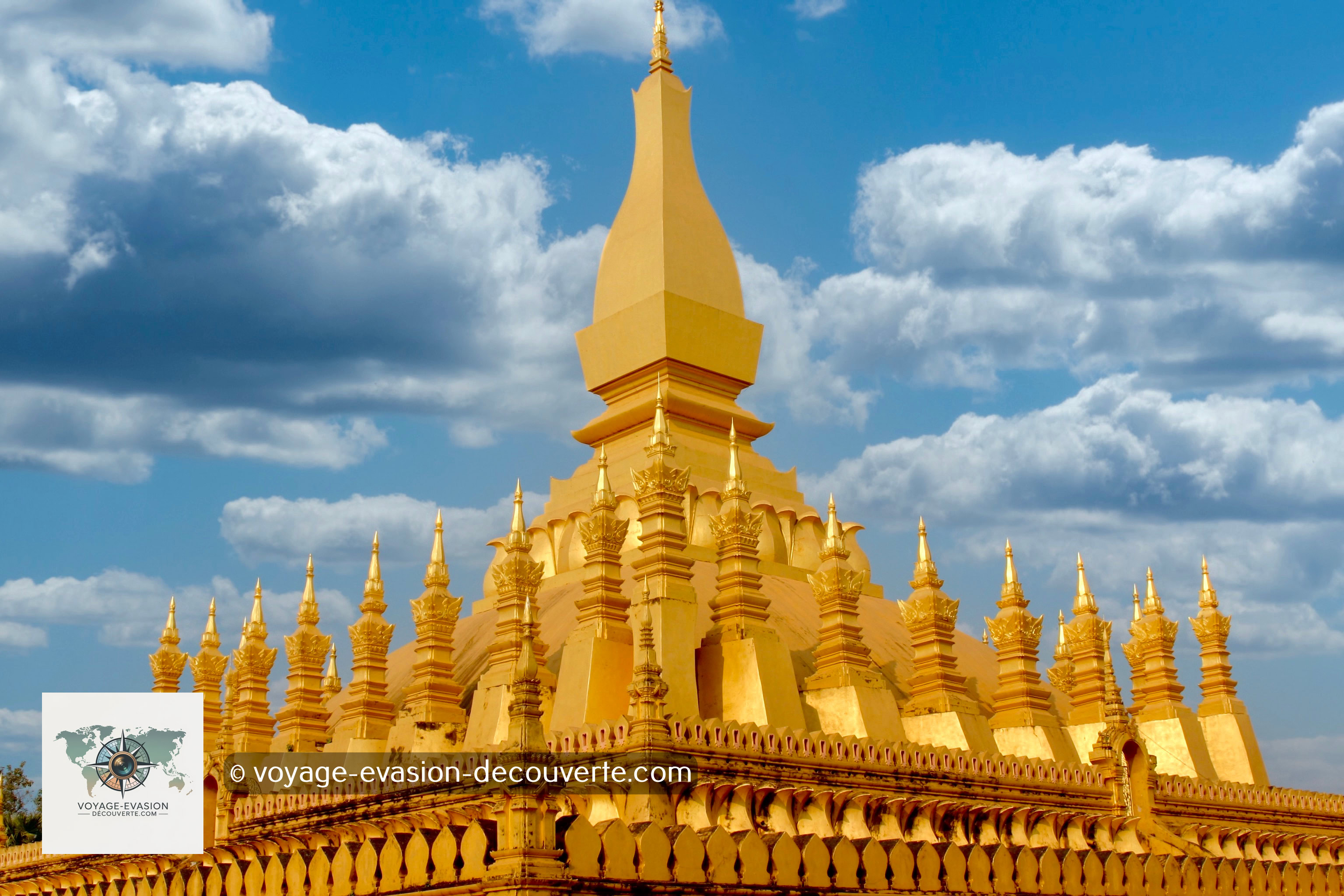 Haut de 35 mètres, il reflète une influence cinghalaise et constitue un exemplaire unique au Laos.