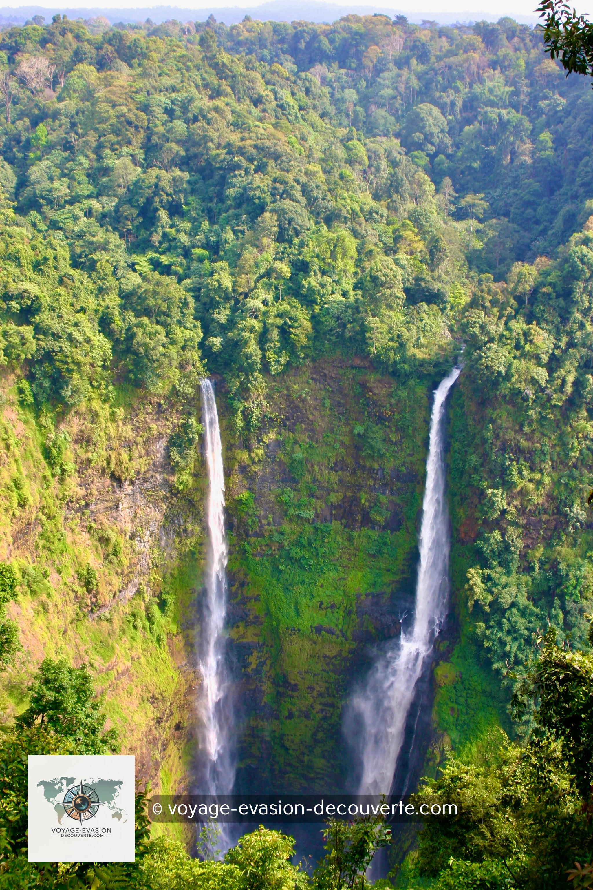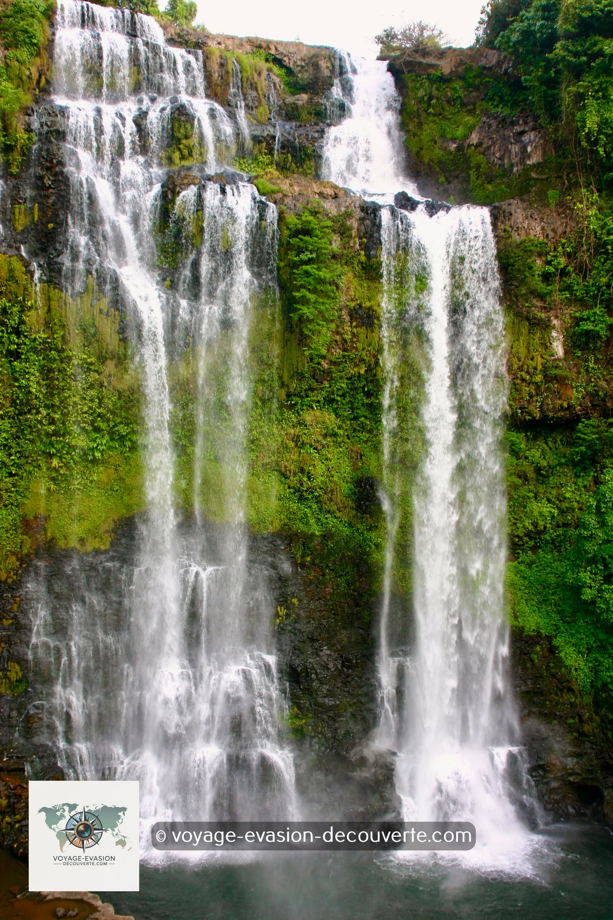 Elles jaillissent à plus de 120 mètres de hauteur, formant un double panache d'eau qui disparaît dans un gouffre profond cerné de végétation luxuriante.