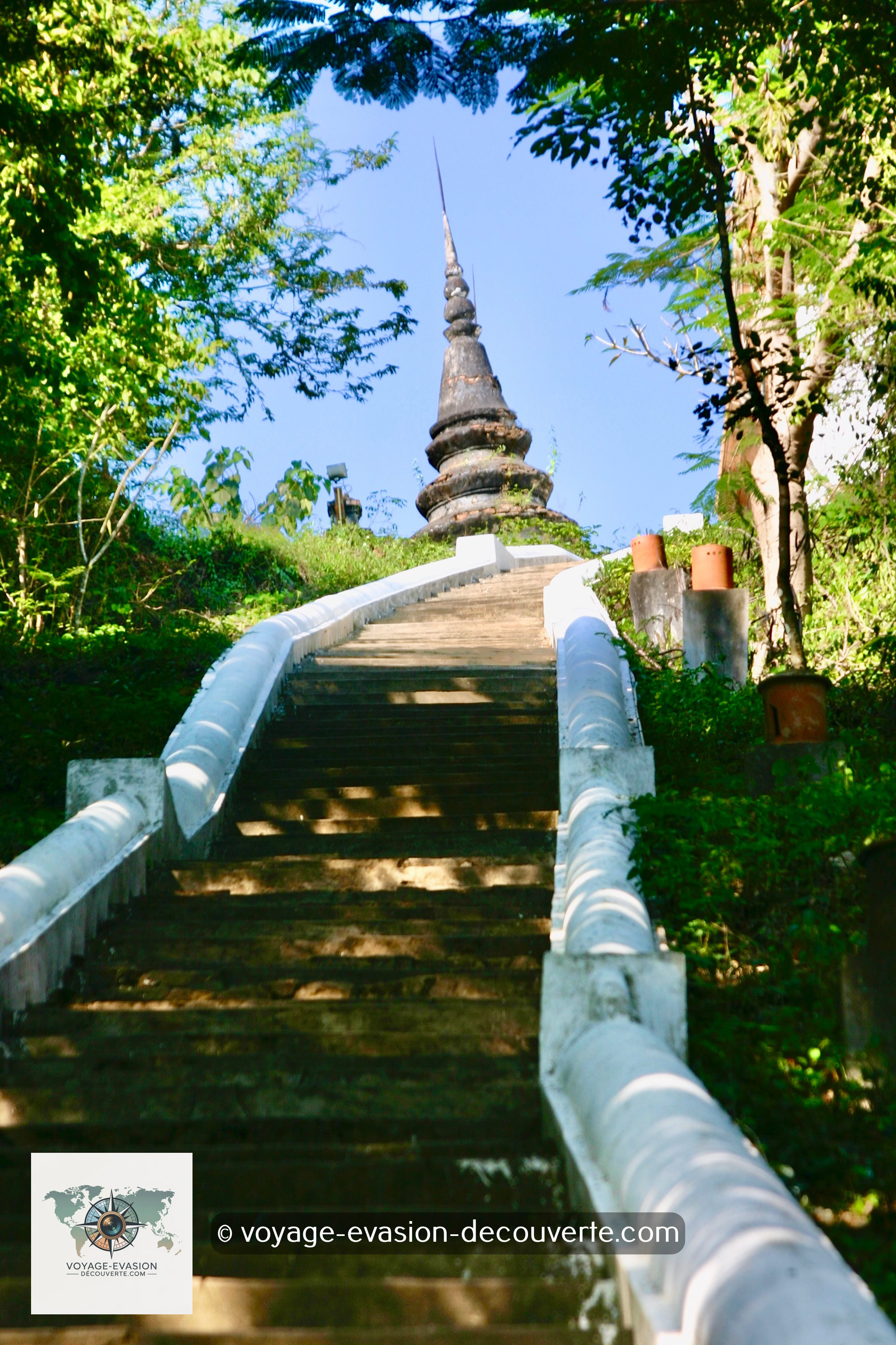 Au sommet se trouve le temple Wat Tham Phousi, orné d'une pagode dorée.