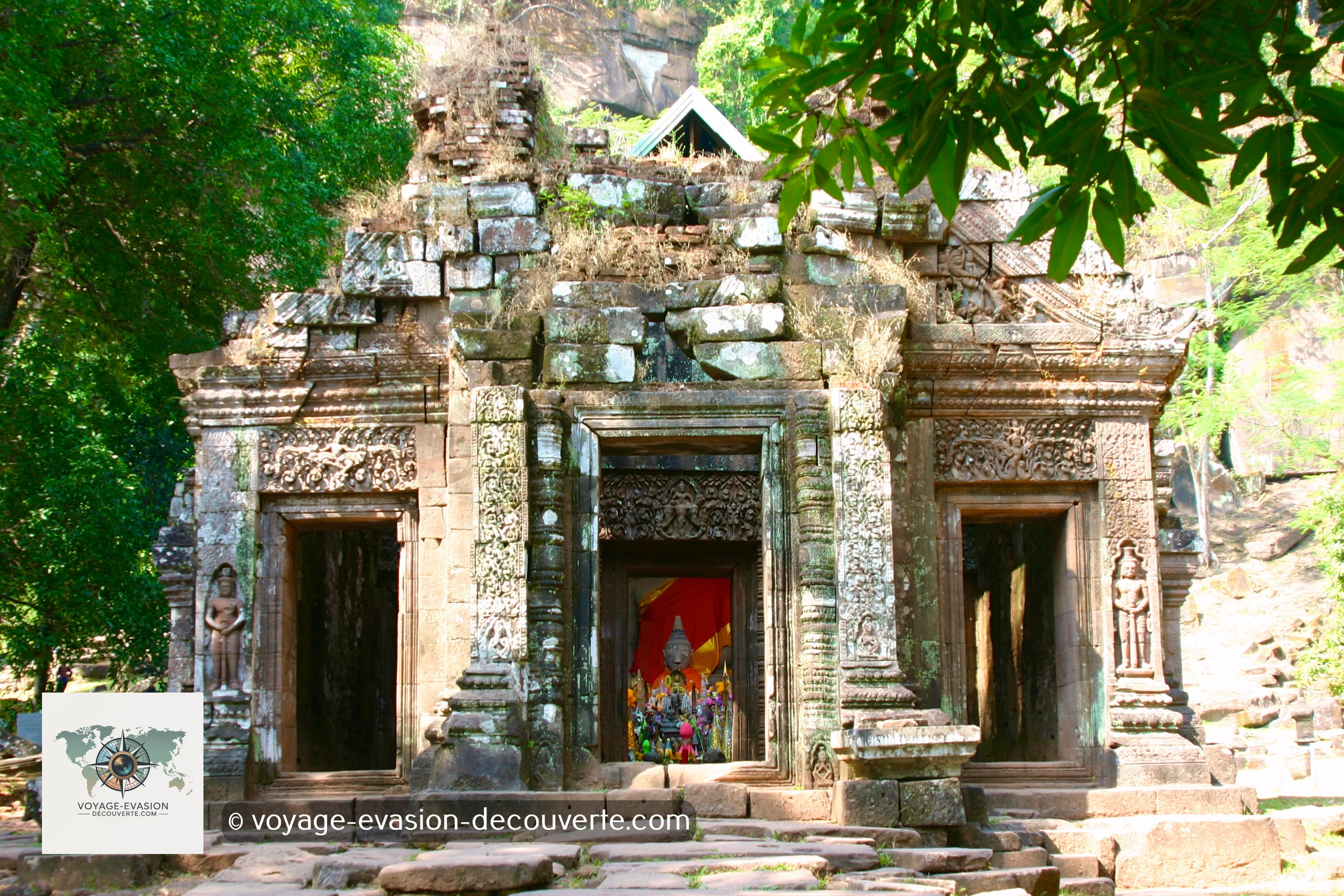 Là se dresse le sanctuaire principal du Wat Phou, encore en activité : les habitants des villages voisins viennent y prier et déposer des offrandes.